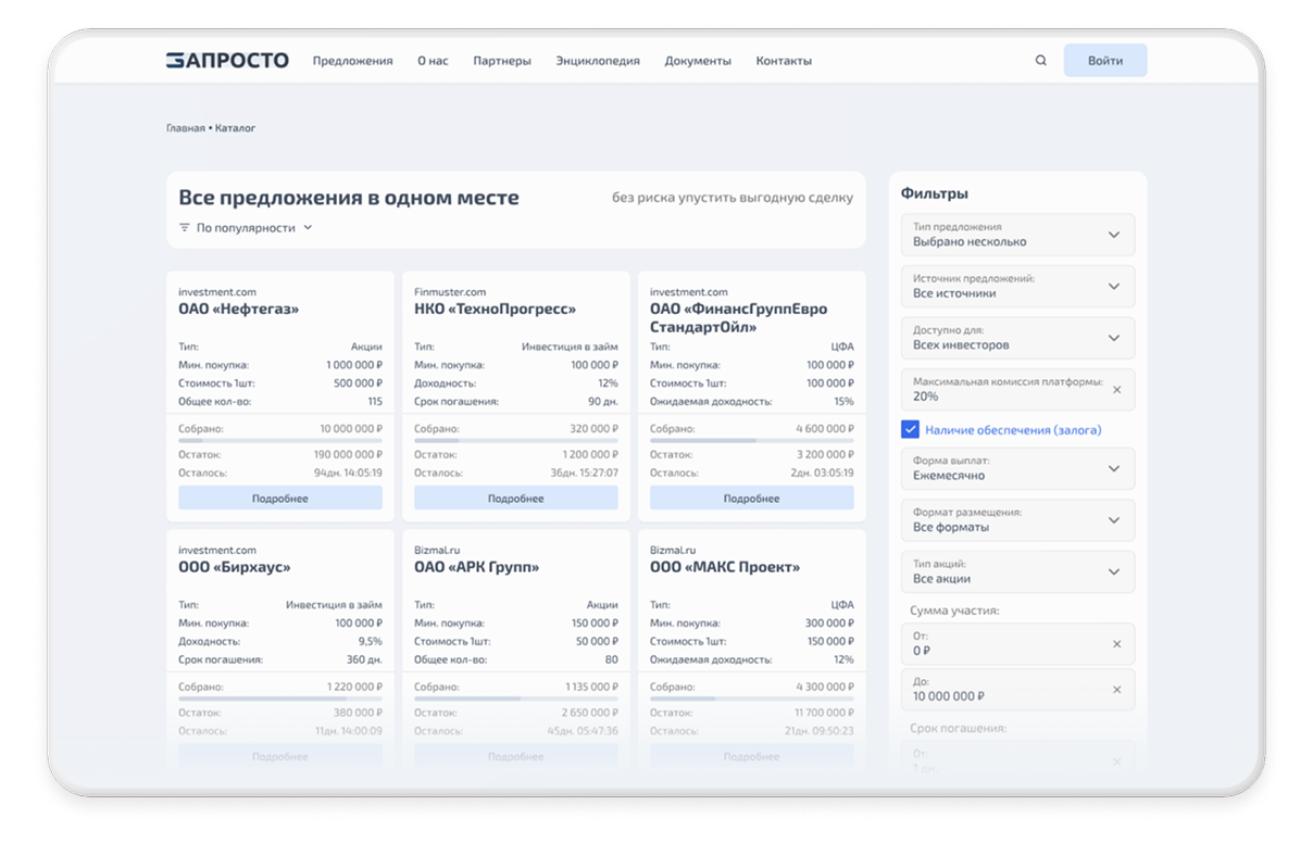 Запросто помогает находить лучшие проекты, сравнивать выгоду и инвестировать на разных платформах через единый цифровой профиль.